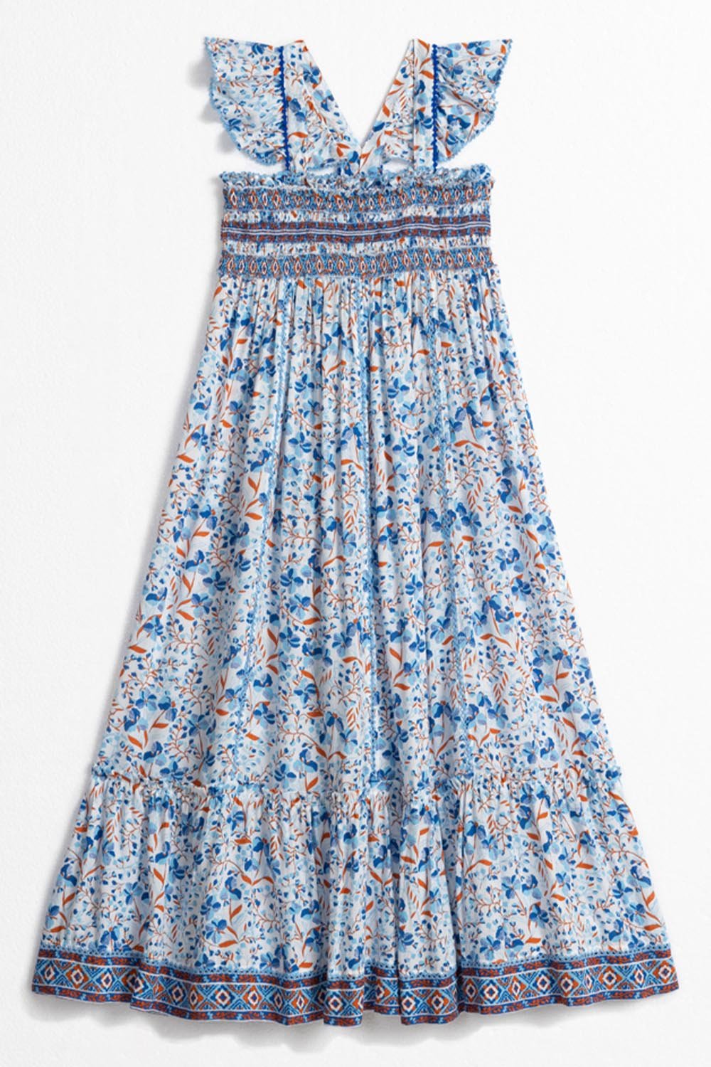 Introducing our Cindy midi dress in a lightweight eco-responsible Viscose! This adorable style features cross back straps with a smocked bodice, baby ruffles and pompom tapes.