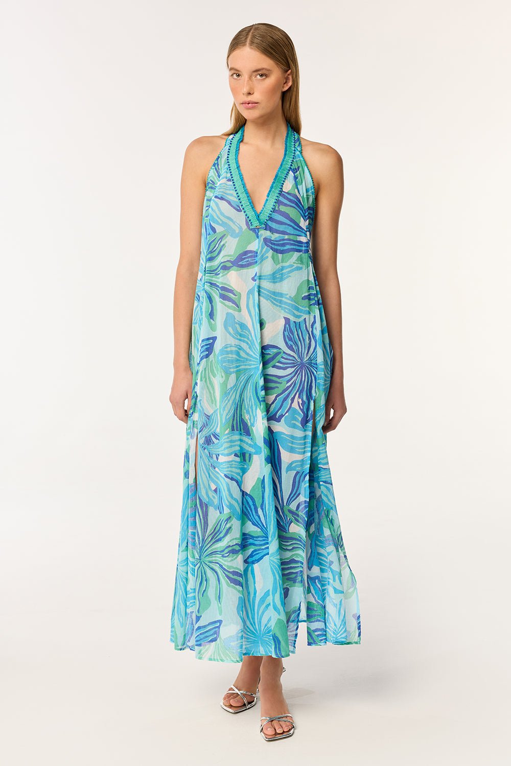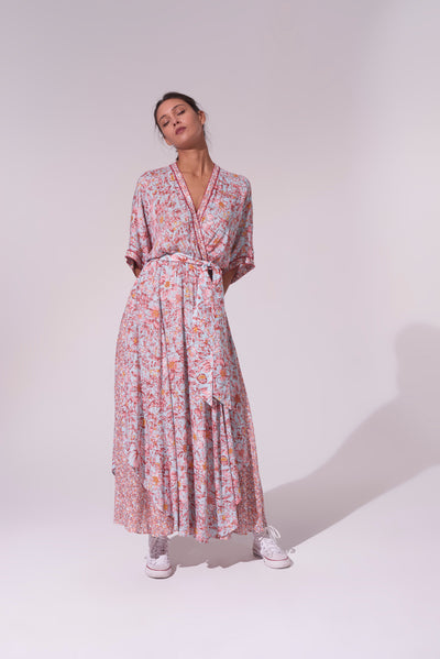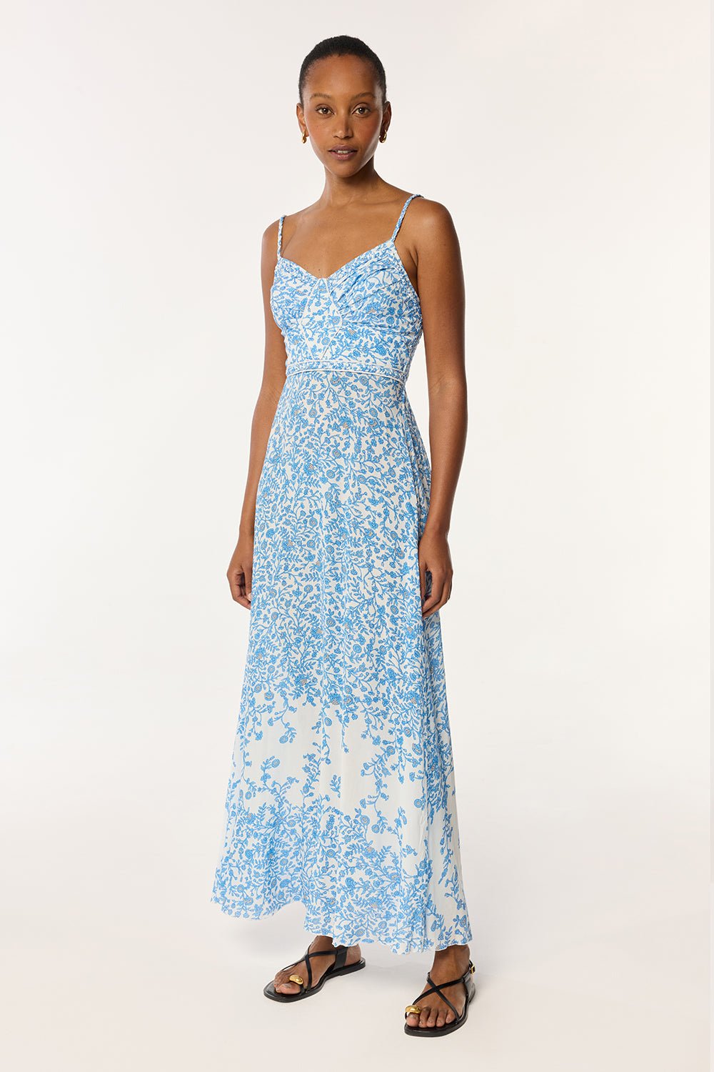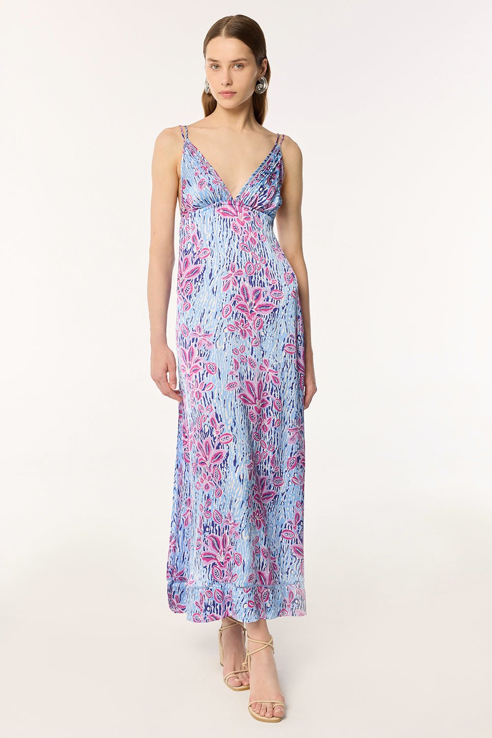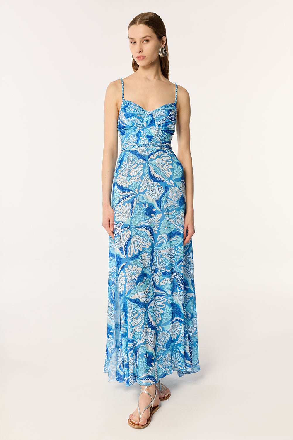 The Long Dress Nava is a shining example—crafted in a delicate blue floral print with a high