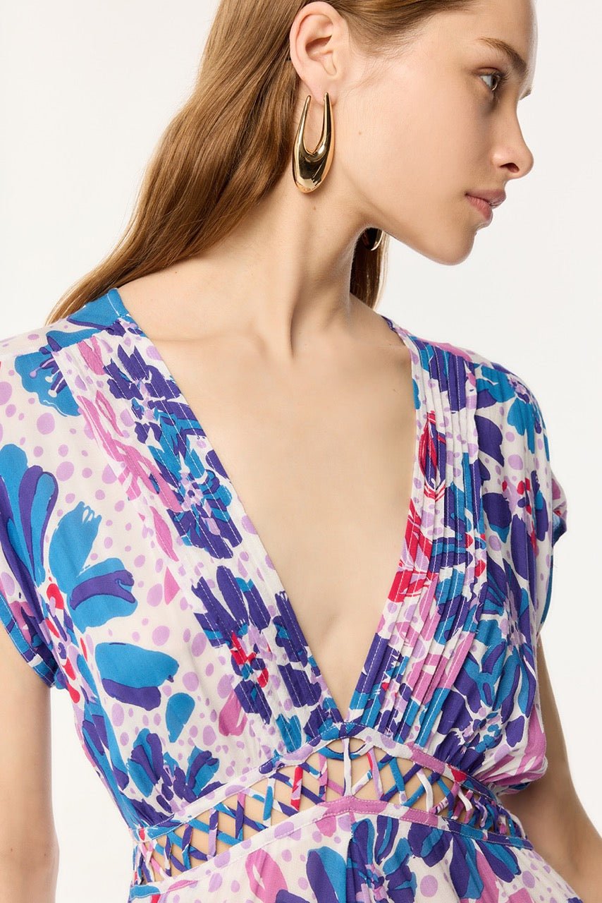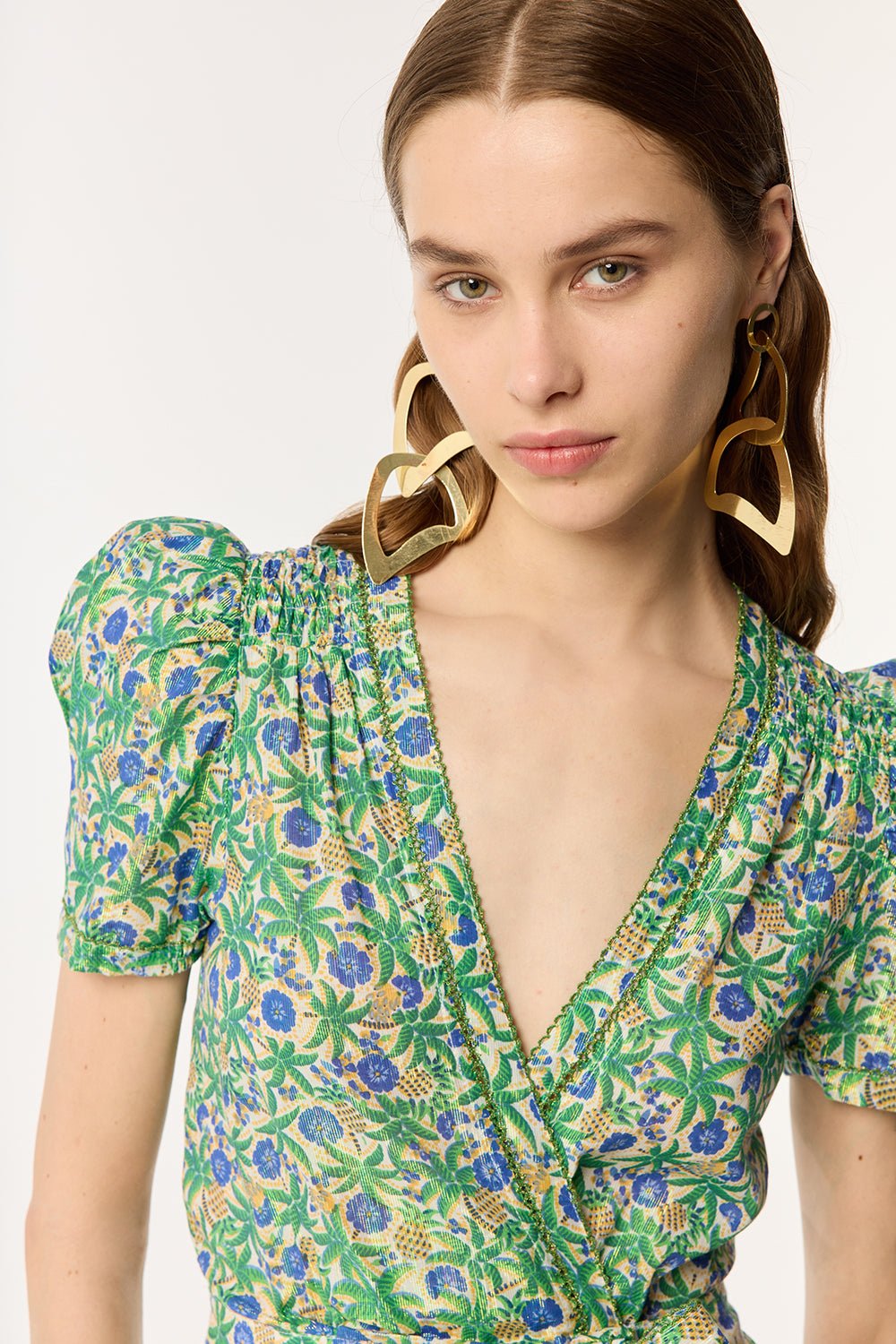 floral print is both playful and polished. It features an elegant neck, a breezy sleeve, and a cinched