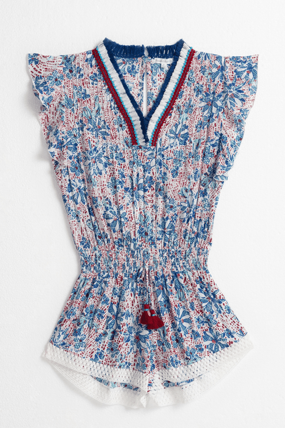 Notre modèle emblématique Sasha se décline désormais dans cette magnifique combinaison. Il présente nos célèbres manches papillon, notre col à franges et un short vaporeux avec une taille élastique et des ourlets en dentelle.