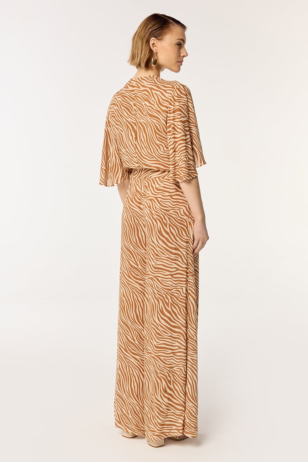 Confectionnée en viscose légère, elle accompagne chaque mouvement avec fluidité, sublimée par un décolleté plongeant qui apporte une touche audacieuse.