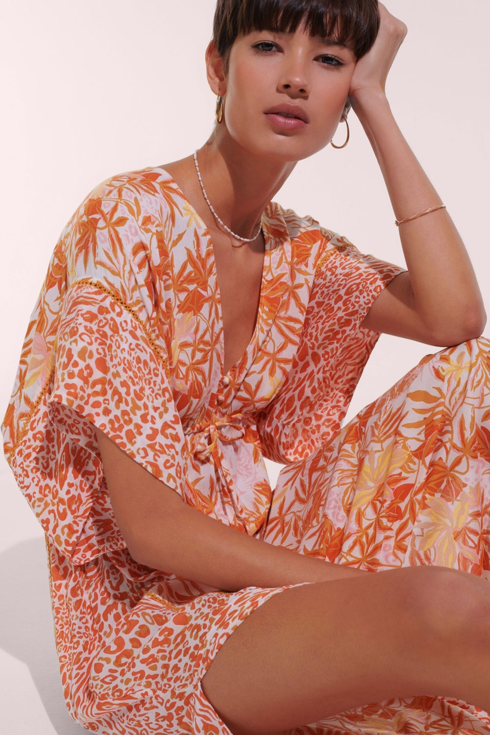 Une robe caftan longue accentuée par des manches courtes kimono et un décolleté profond en V, avec une fente généreuse dans le bas. La taille haute est resserrée par un lien coulissant, complétée par des pompons colorés. La broderie croisée ajourée ajoute des détails, mettant en valeur les motifs floraux et tressés verticaux.