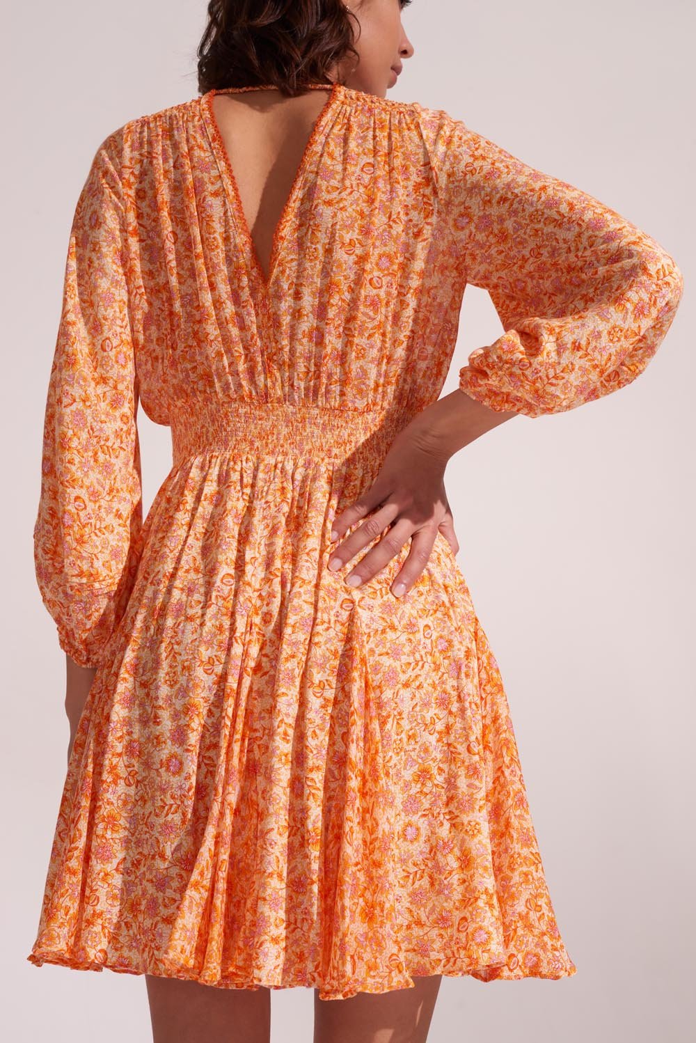 Une robe courte aux manches longues bouffantes transparentes. Des plis animent la robe : sur les épaules, sur la taille, sur les manches. Les décolletés, poitrine et dos, sont très profonds et soulignés de passementerie. Dans le dos, au niveau des épaules, un lien élastique. La jupe droite à carènes permet d'élargir le bas de la jupe tout en subtilité. Alternant viscose et crêpe de viscose, Anabelle joue avec les transparences.