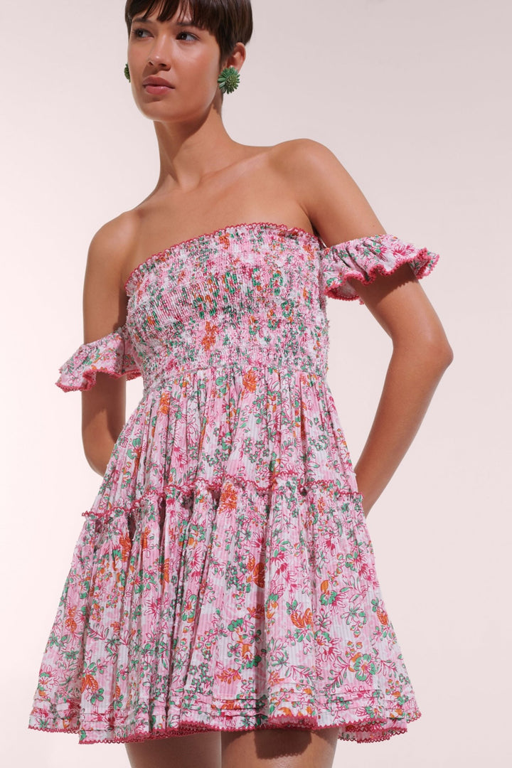 Robe courte à épaules dénudées intemporelle et élégante, Aurora in Pink Sweet Liberty captive par son imprimé floral, ses manches courtes à volants délicats et son buste smocké, créant une silhouette romantique.