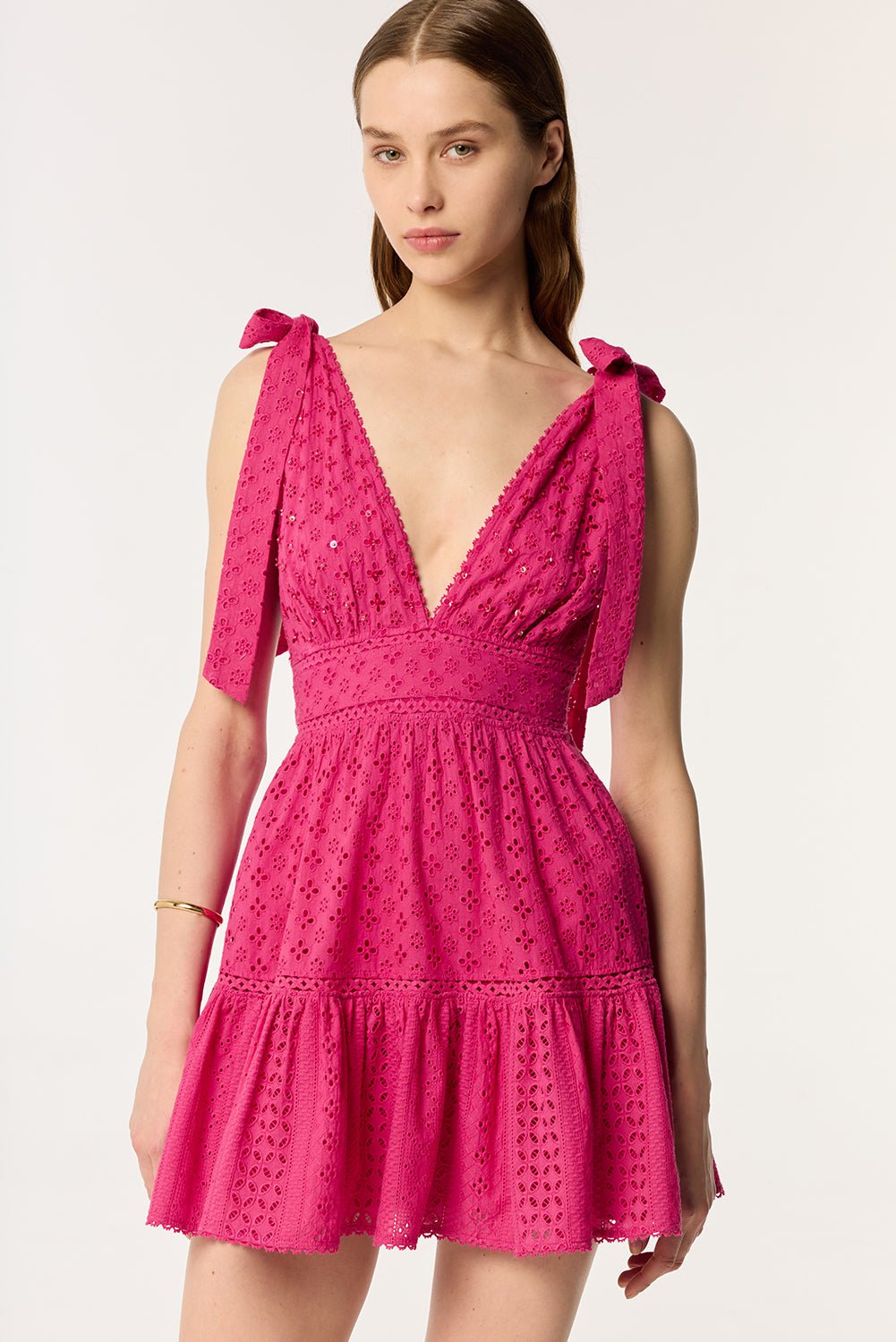 Cette robe romantique se distingue par ses épaules ornées de nœuds ajustables et ses bandes de dentelle délicate. Dans le style broderie anglaise, le buste est sublimé par des perles et des paillettes, ajoutant une touche d'élégance.