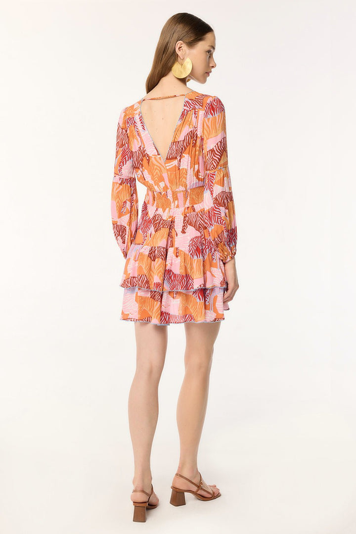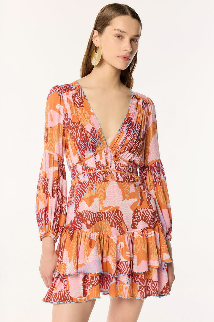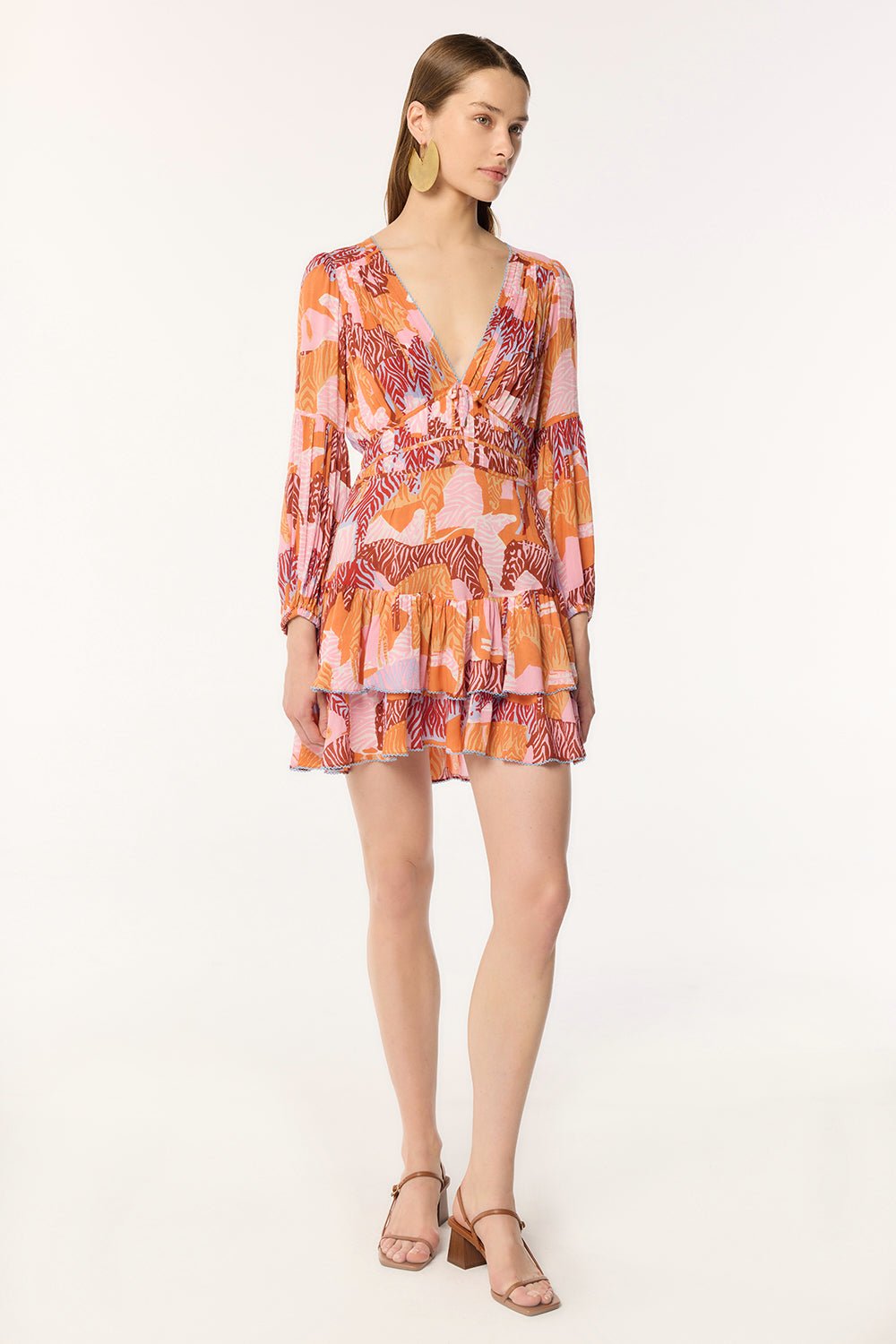 La robe courte Chiara, signée Poupette St Barth, présente un décolleté en V plissé sur le devant et à l'arrière du look, surmonté de dentelle et terminé par un nœud délicat sur le devant. Elle se distingue par des manches trois-quarts longues légèrement ballon et une jupe fluide et volantée qui apporte mouvement et légèreté.