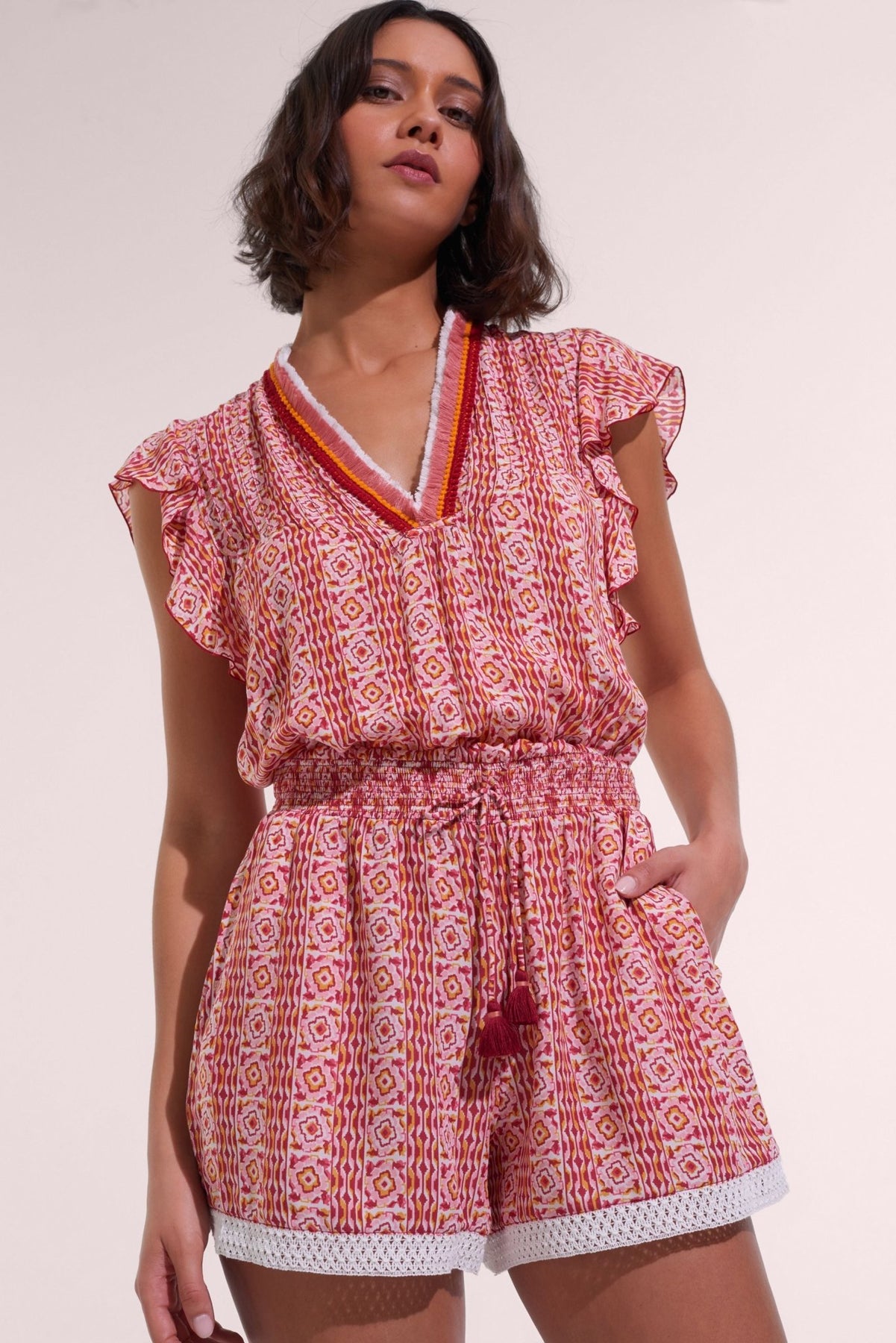 La combinaison courte Sasha de Poupette St Barth est un classique intemporel avec un col à franges vibrant, des manches flottantes et une délicate bordure en dentelle à l'ourlet. Un lien à nouer avec de charmants pompons à la taille et une fermeture à boutonnière au dos ajoutent des accents ludiques au modèle. Parfait pour créer un look chic et sans effort à la plage.