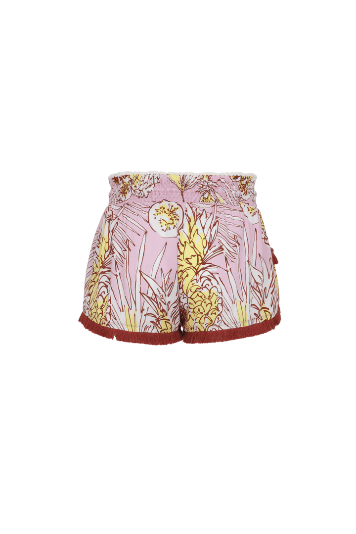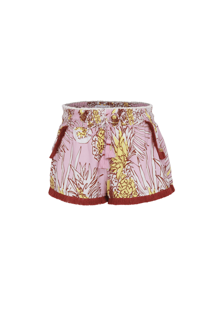 The fringed finishes of its faux pockets and its pompons add a delicate feminine touch, ideal for a mini short. Its fluid and lightweight fabric ensures optimal comfort, perfect for a seaside stroll.