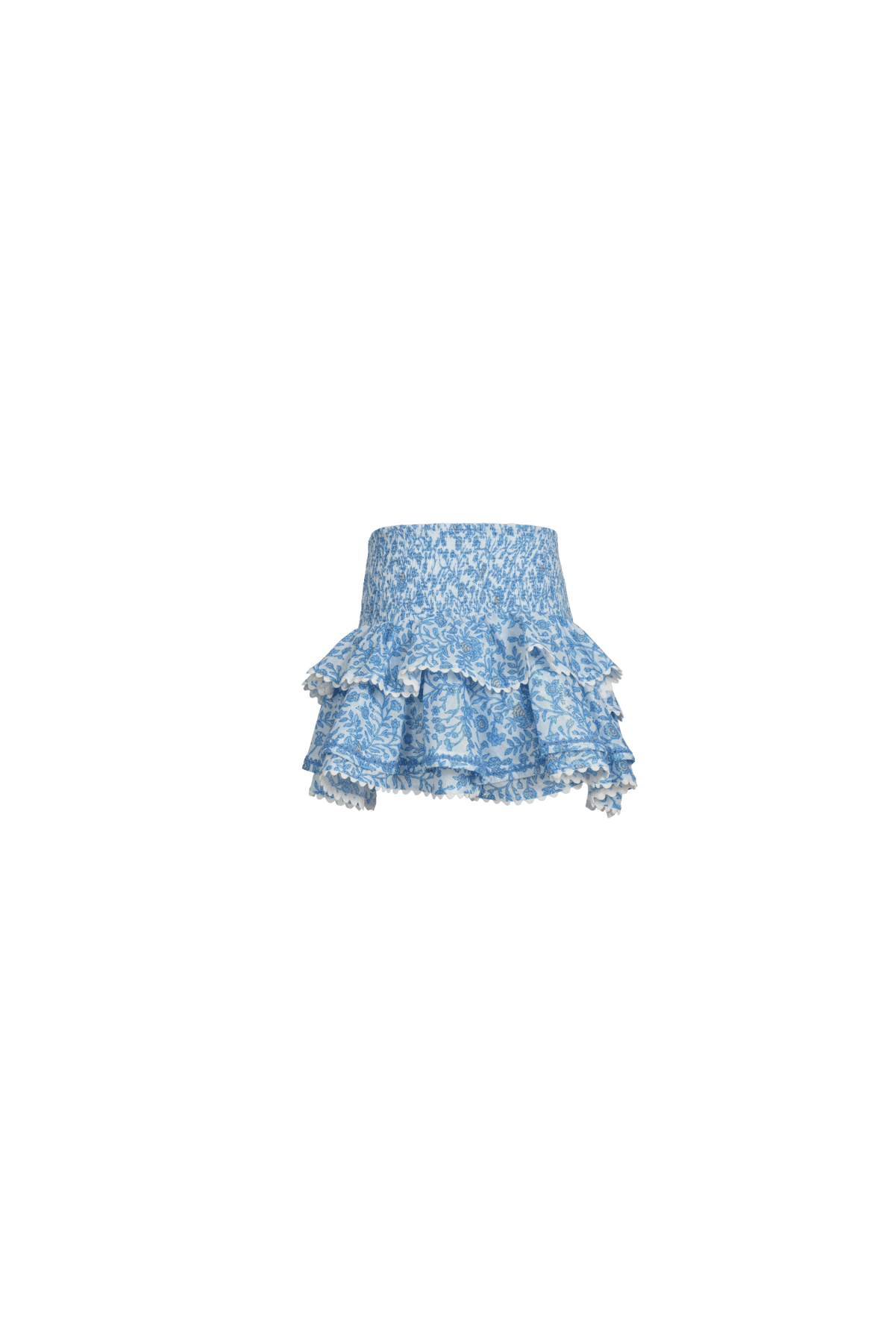 The skirt features several ruffles, each adorned with richly detailed finishes, creating an airy and sophisticated effect.