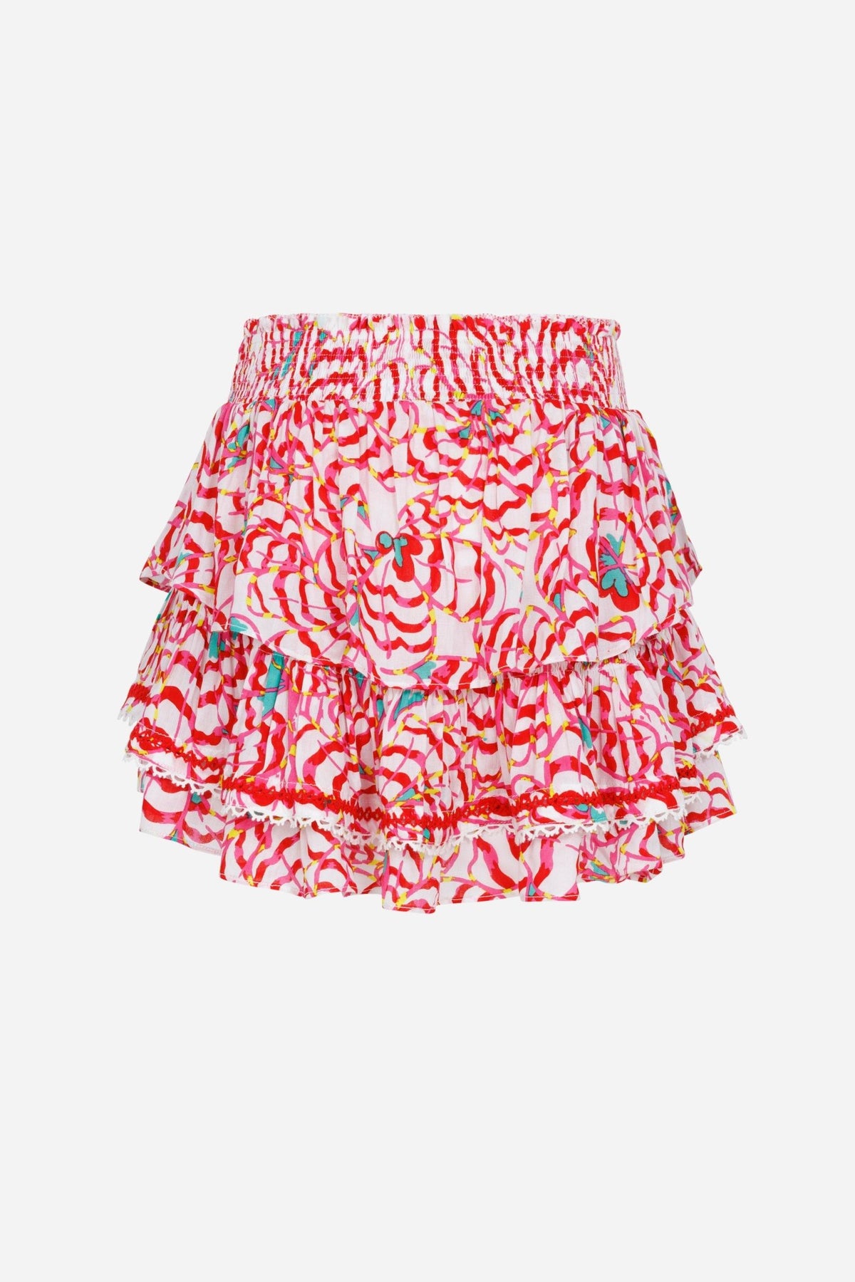 The Kids Mini Skirt Ariane, a stylish kids' version of the corset-inspired favourite. This mini design is accented with successive ruffles, an elastic waistband and colored piping details. It's a chic and mini design that effortlessly embodies style.