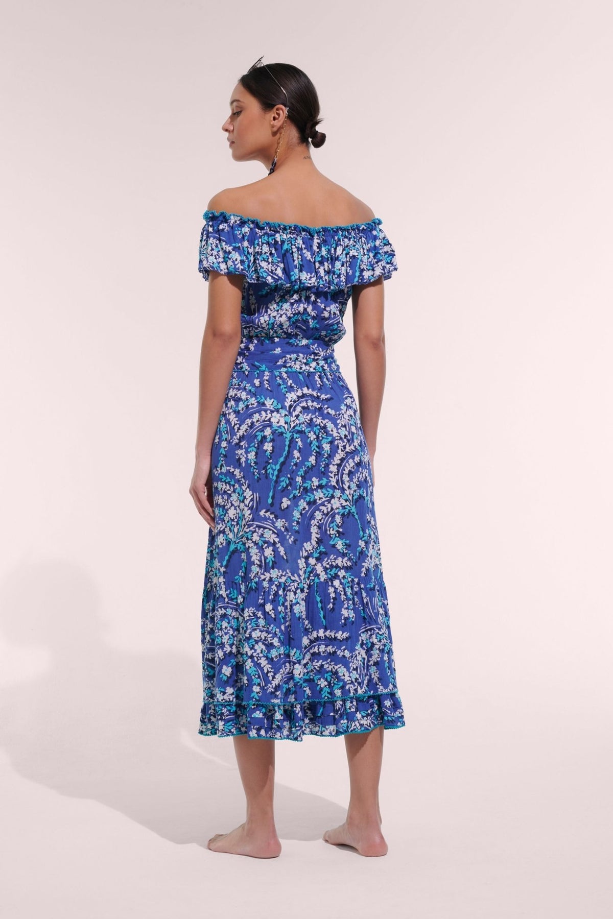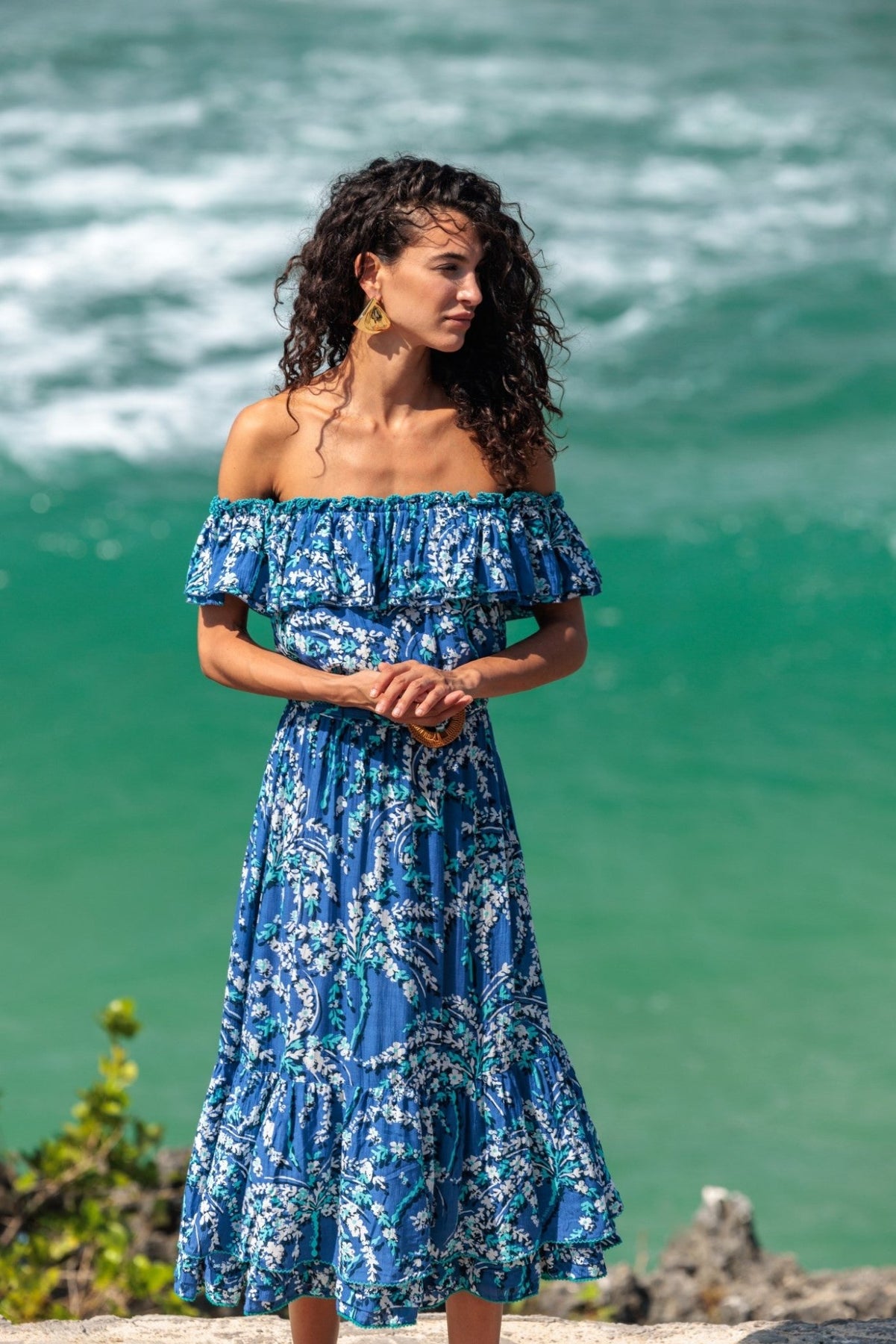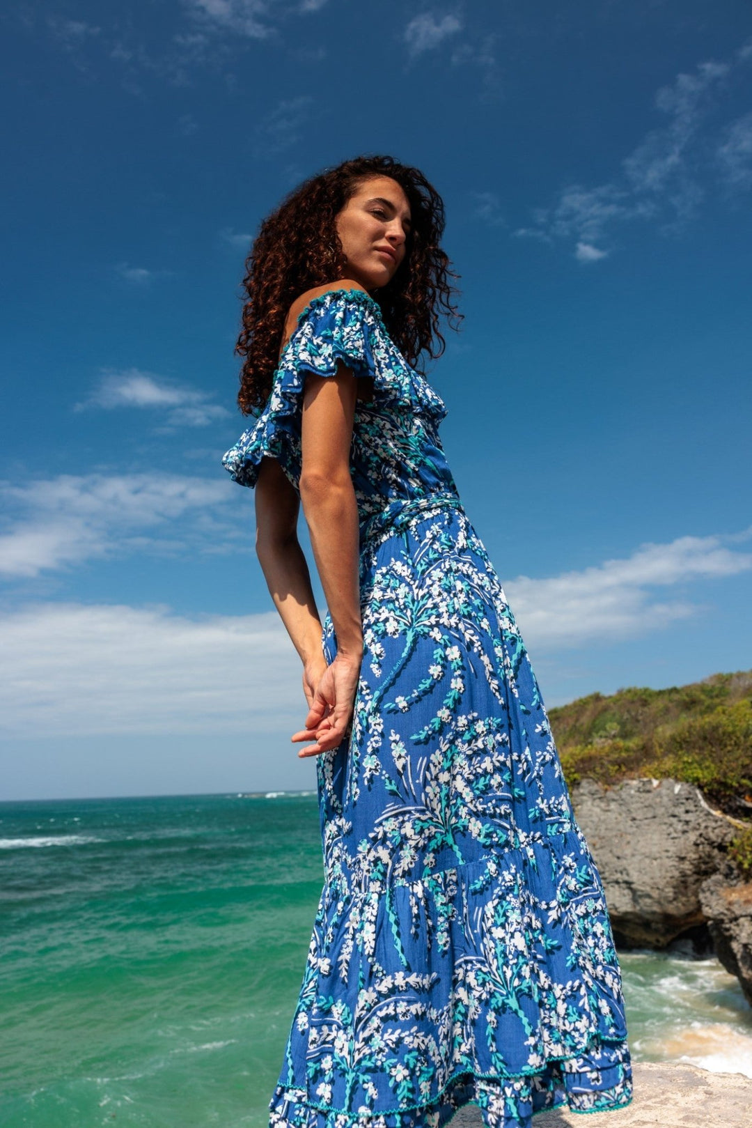 Long Dress Bella is a long, flowy, off-the-shoulder dress with a belted waist, striking the perfect balance between elegance and a romantic summer aesthetic. Its graceful silhouette, accentuated by a refined floral print and textured ruffled shoulders, effortlessly combines style and comfort. Versatile, it allows you to exude timeless charm with ease.