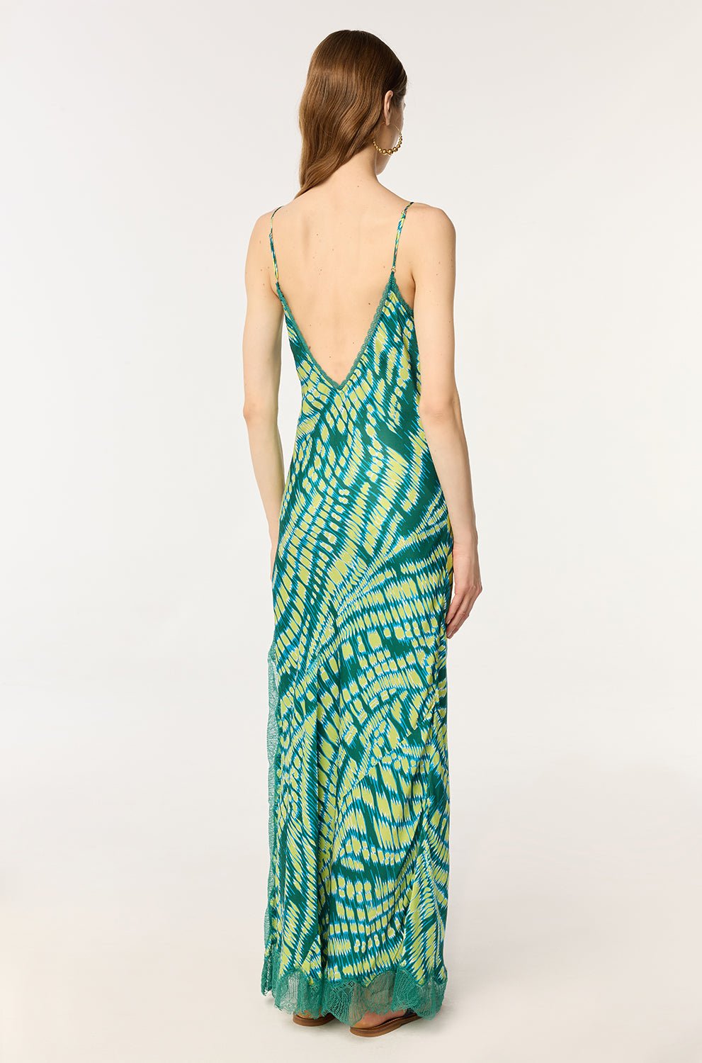 A wide lace band adorns the hem and extends along a slit up the leg for a bold touch. A finer lace band delicately highlights the neckline at the front and back.