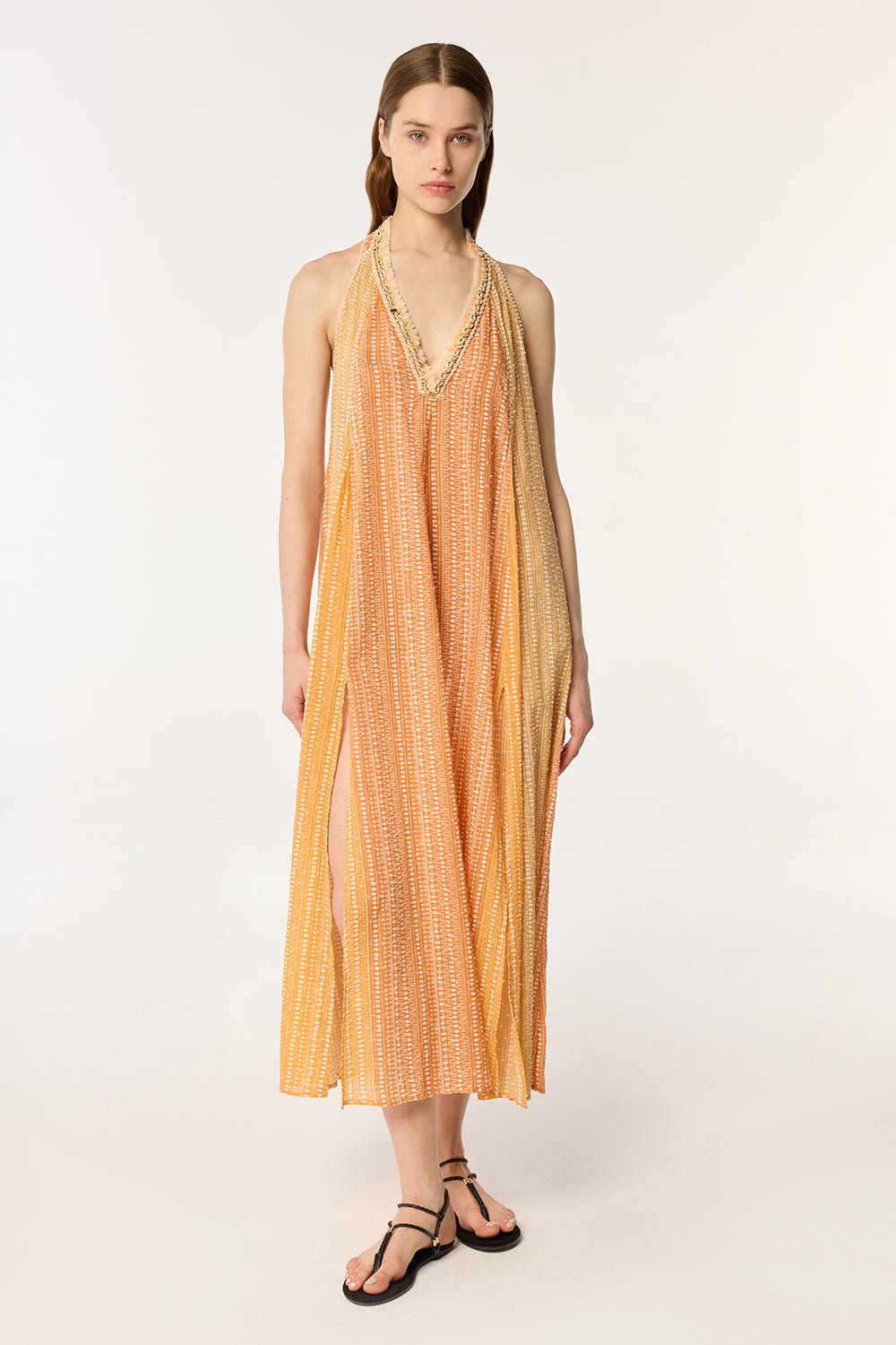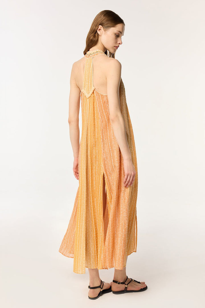 The Nava long dress combines modernity and fluidity with its slit skirt that adds graceful movement with every step.