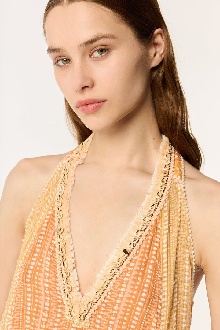 Its racerback style highlights the silhouette, while the fringed neckline evokes the iconic Sasha Mini dress, adding Poupette St Barth’s signature refined touch.