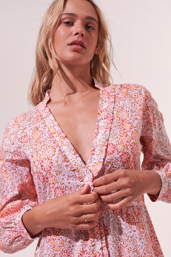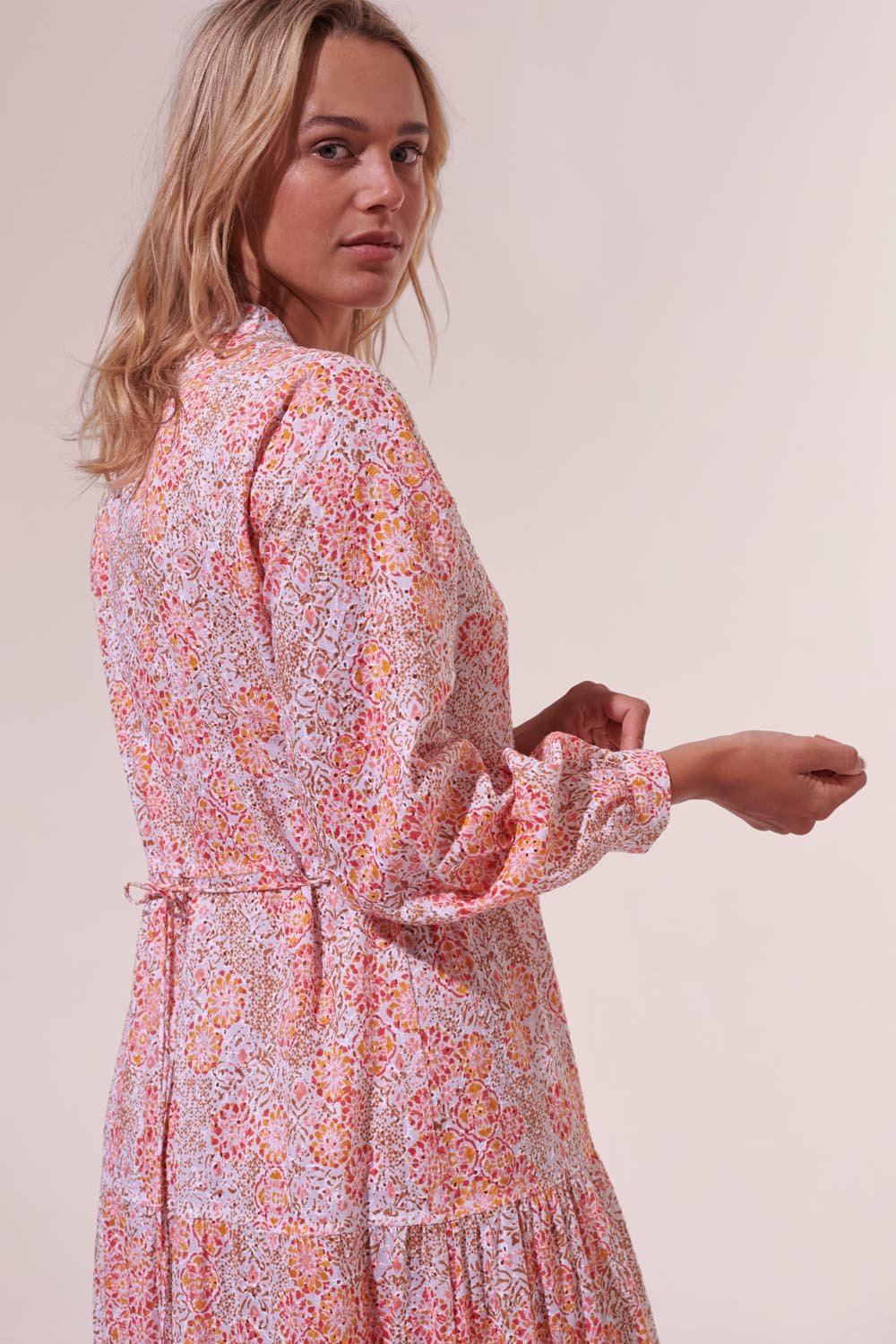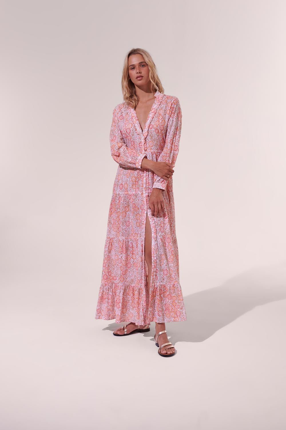 There is a delicate and demure vibe to the Rita Dress. The dress is handmade and decorated with a "wise" white print that lends a dreamy quality to the long-sleeved design. Slip on a pair of raffia wedges to make the most of the full, flared skirt.