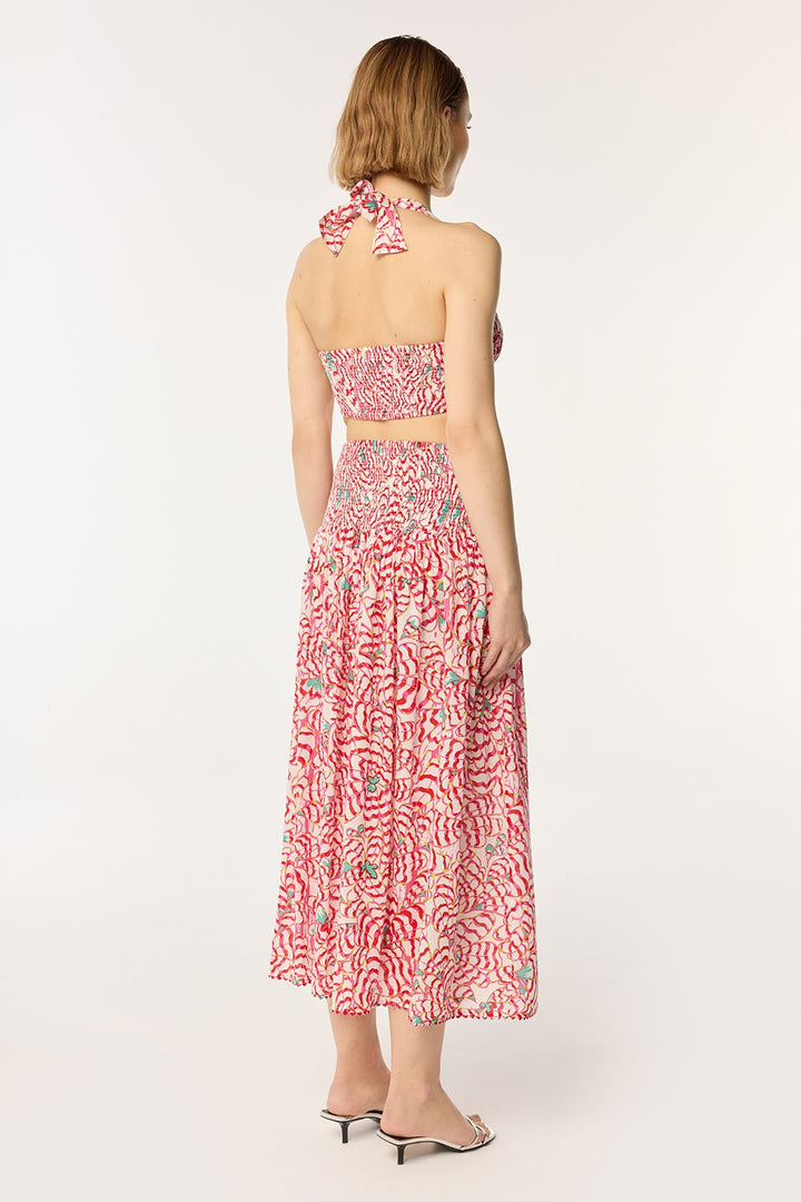 An asymmetrical long skirt with horizontal pleating at the waist, accented by a cord on the side. The cord extends to the knees and is finished with colourful beads. The skirt's contours are highlighted by a serpentine ribbon running the entire length, continuing up to the waist along the side slit.