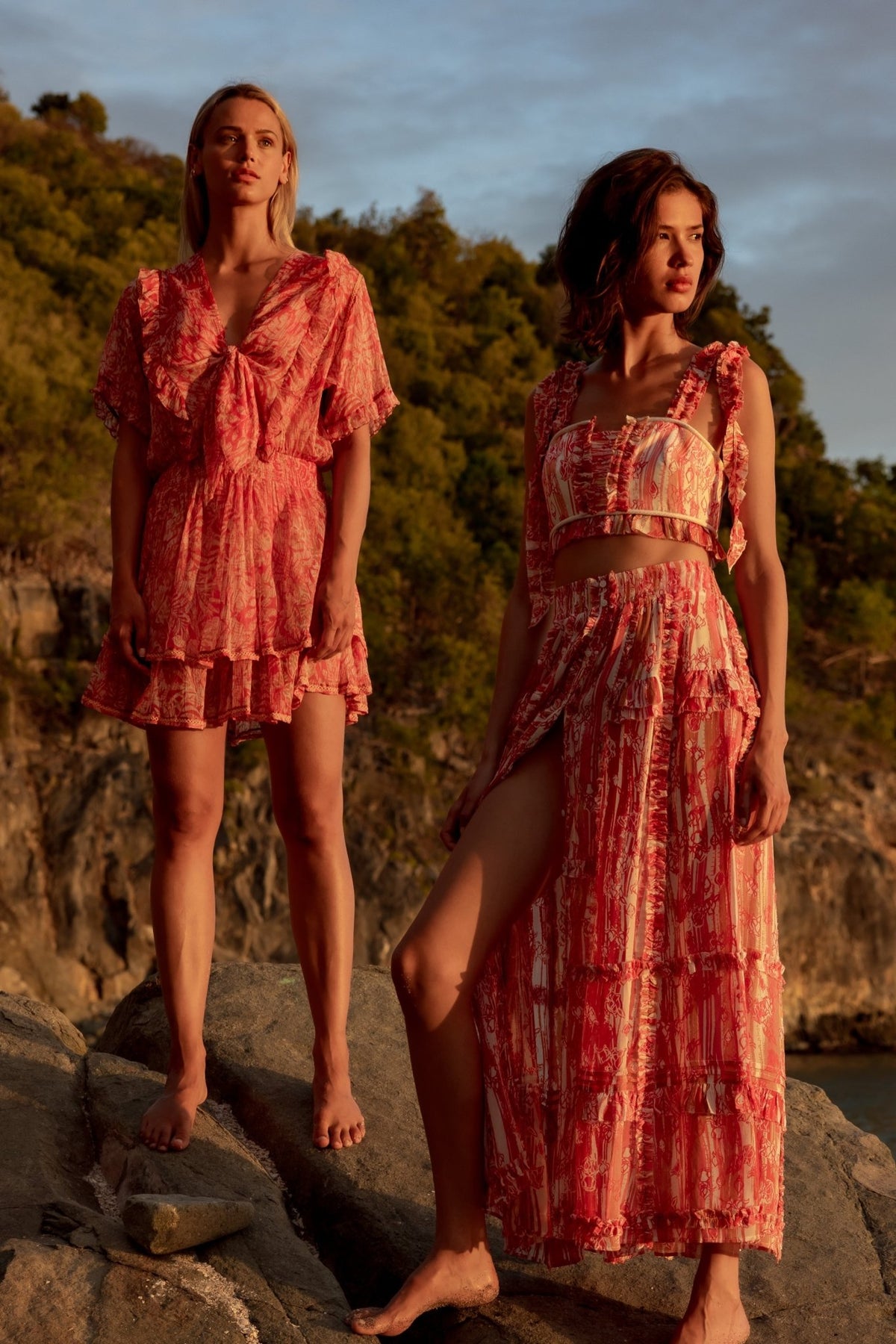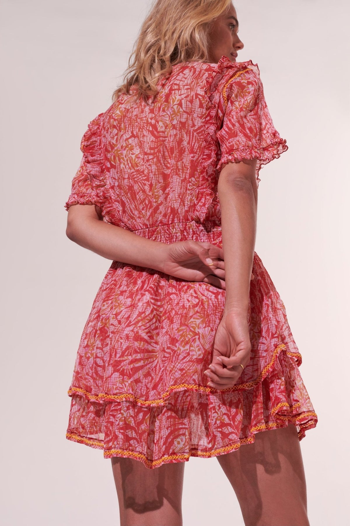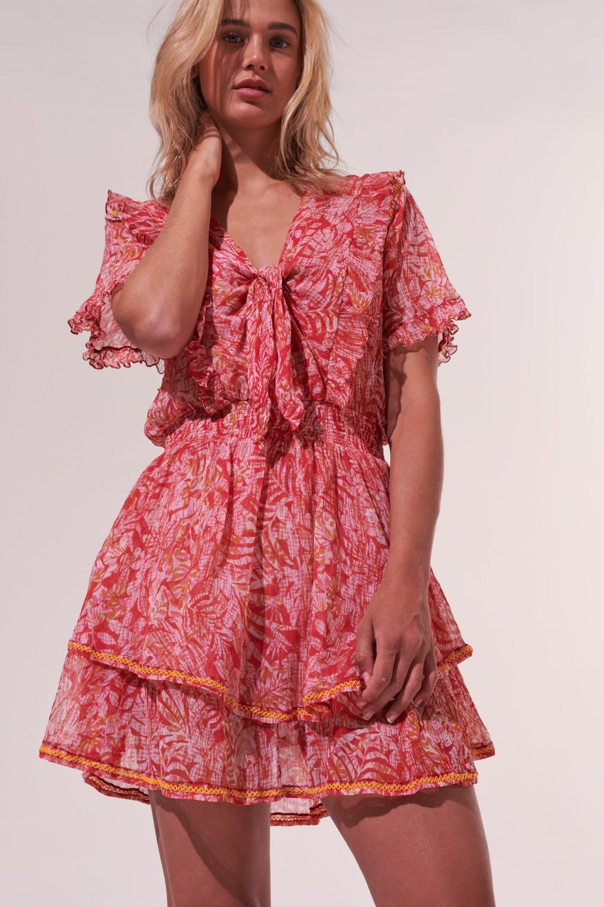 A short dress with short sleeves. It's V-neck is tied in the front by two panels of fabric. The mounted waist is elastic to highlight the silhouette. The double skirt is flared. And to provide even more lightness, the sleeves and the bust are highlighted with small ruffles.