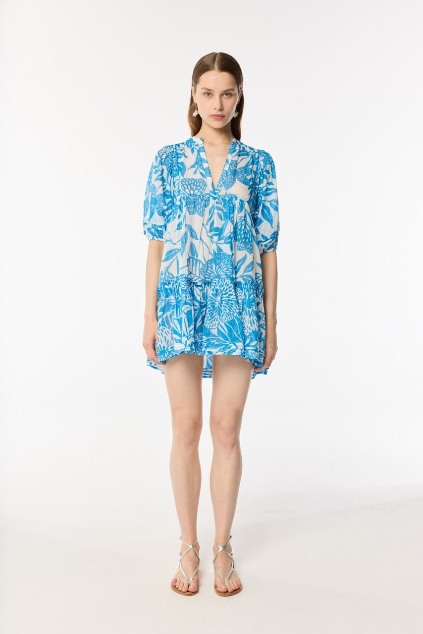 The Mini dress Aria charms with its romantic allure and flared cut. Featuring three-quarter balloon sleeves and a subtle flounce on the skirt, it is lightweight and fluid. It's the perfect piece for a look that's both casual and chic, characteristic of Poupette St Barth.