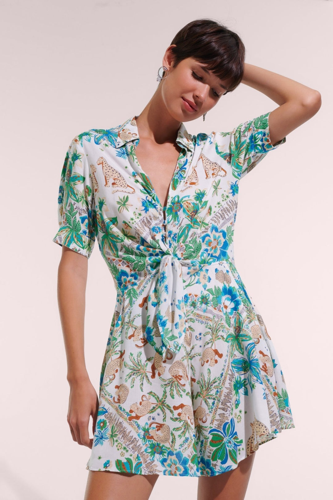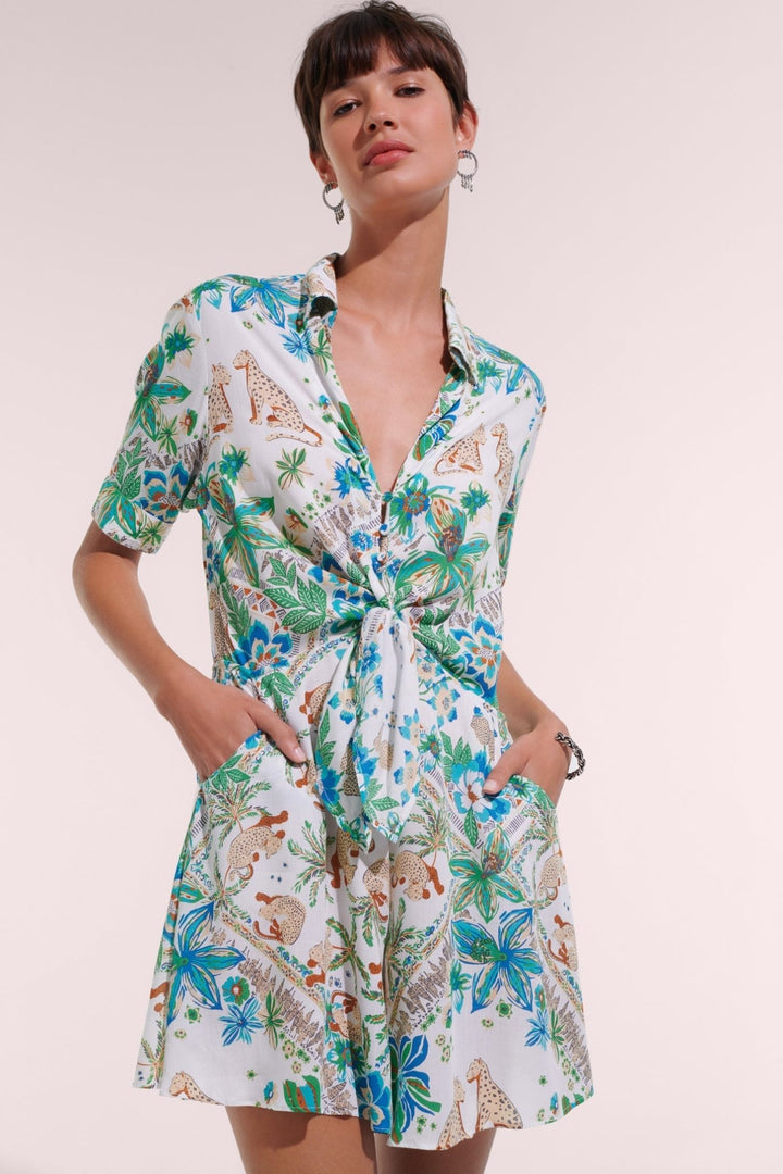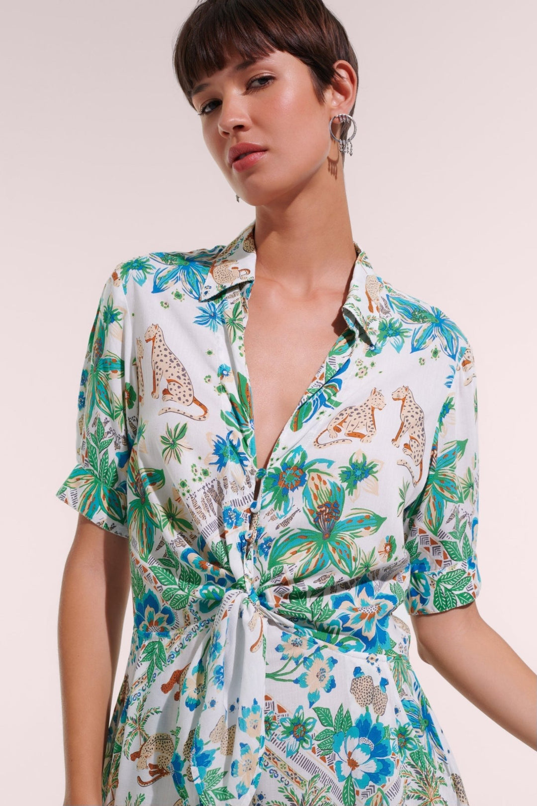 A versatile jumpsuit designed for seamless day-to-night transitions. With a stylish shirt collar V-neck, chic button closures, and a flattering front knot detail for a timeless and elegant aesthetic. Tailored from fluid viscose fabric, this jumpsuit ensures a graceful drape and provides the added convenience of practical pockets.