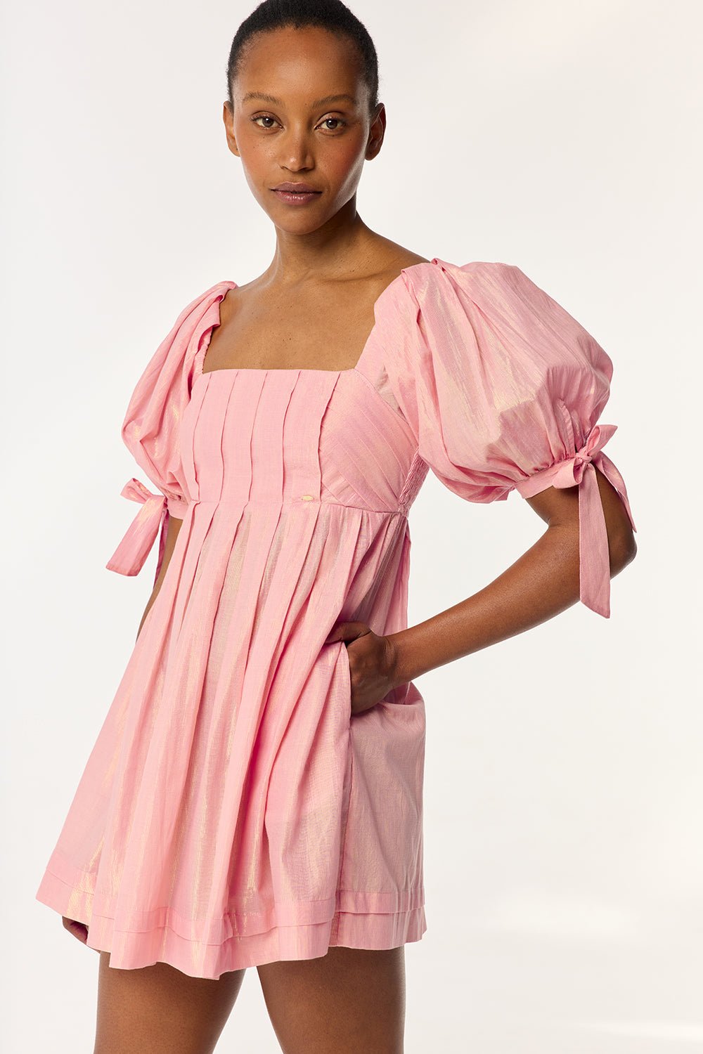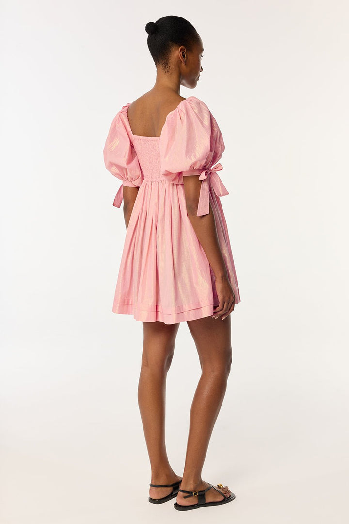 Smocked at the back for an ideal fit, it is adorned with puffed sleeves tied with pretty bows, adding a romantic touch. A small ruffle at the hem adds movement and a refined finish.