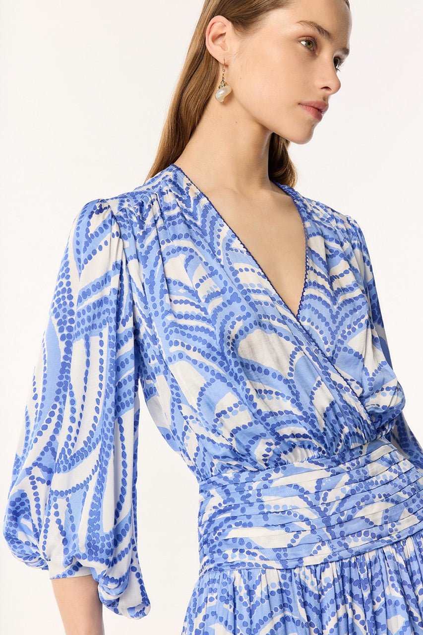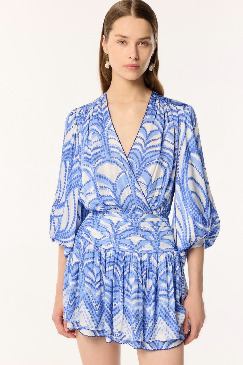 The Colleen Mini dress is defined by its three-quarter-length loose sleeves tightened with a buttoned cuff, creating a blousing effect.