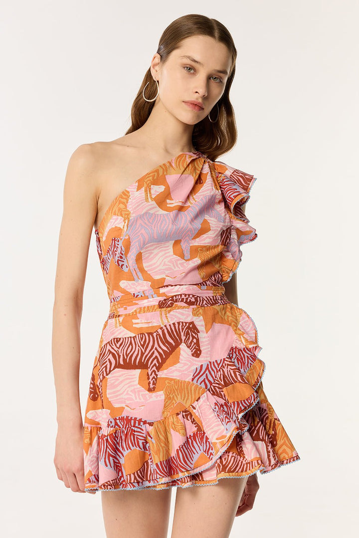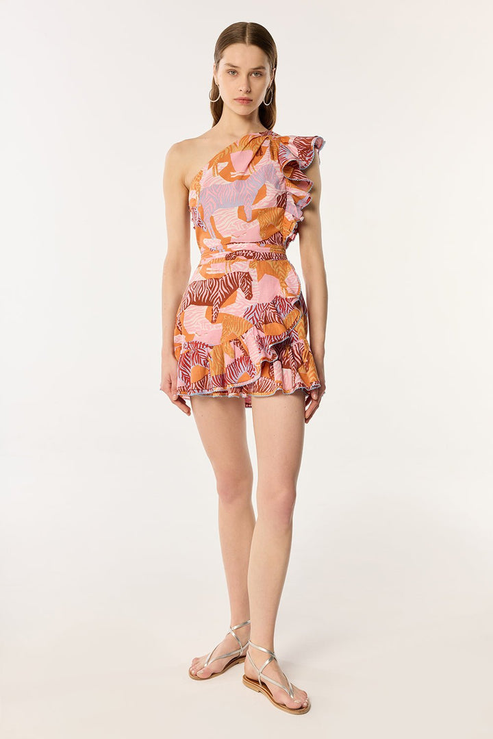 The Corinne mini dress stands out with its asymmetrical design and romantic ruffles on one shoulder in a butterfly sleeve style.