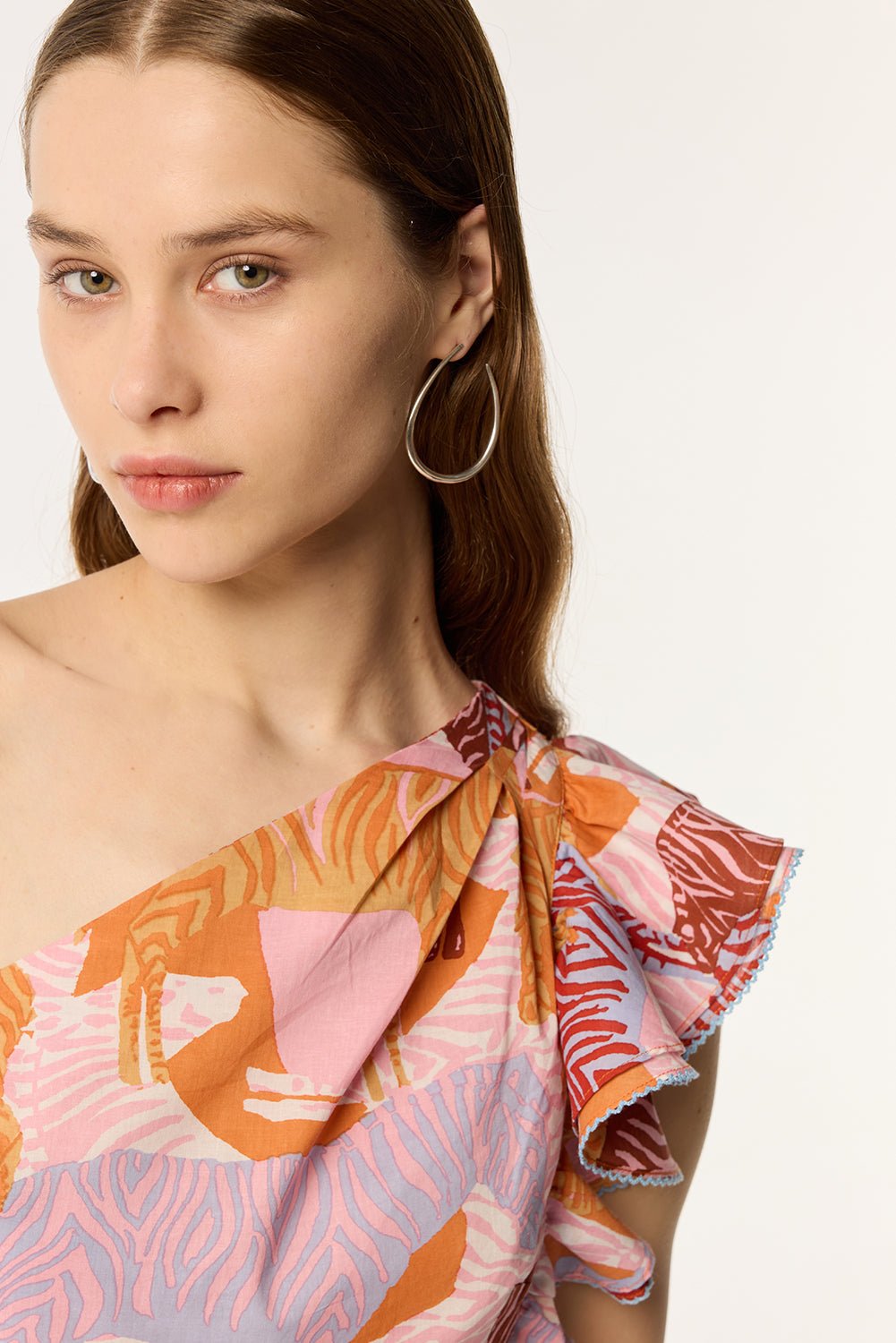 The comfortable waistband, pleated at the front and smocked at the back, accentuates the silhouette. The ruffle at the bottom of the skirt rises delicately toward the sleeve, creating a captivating visual curve.