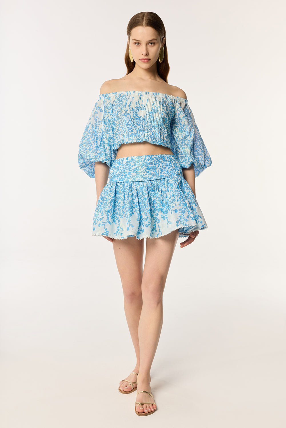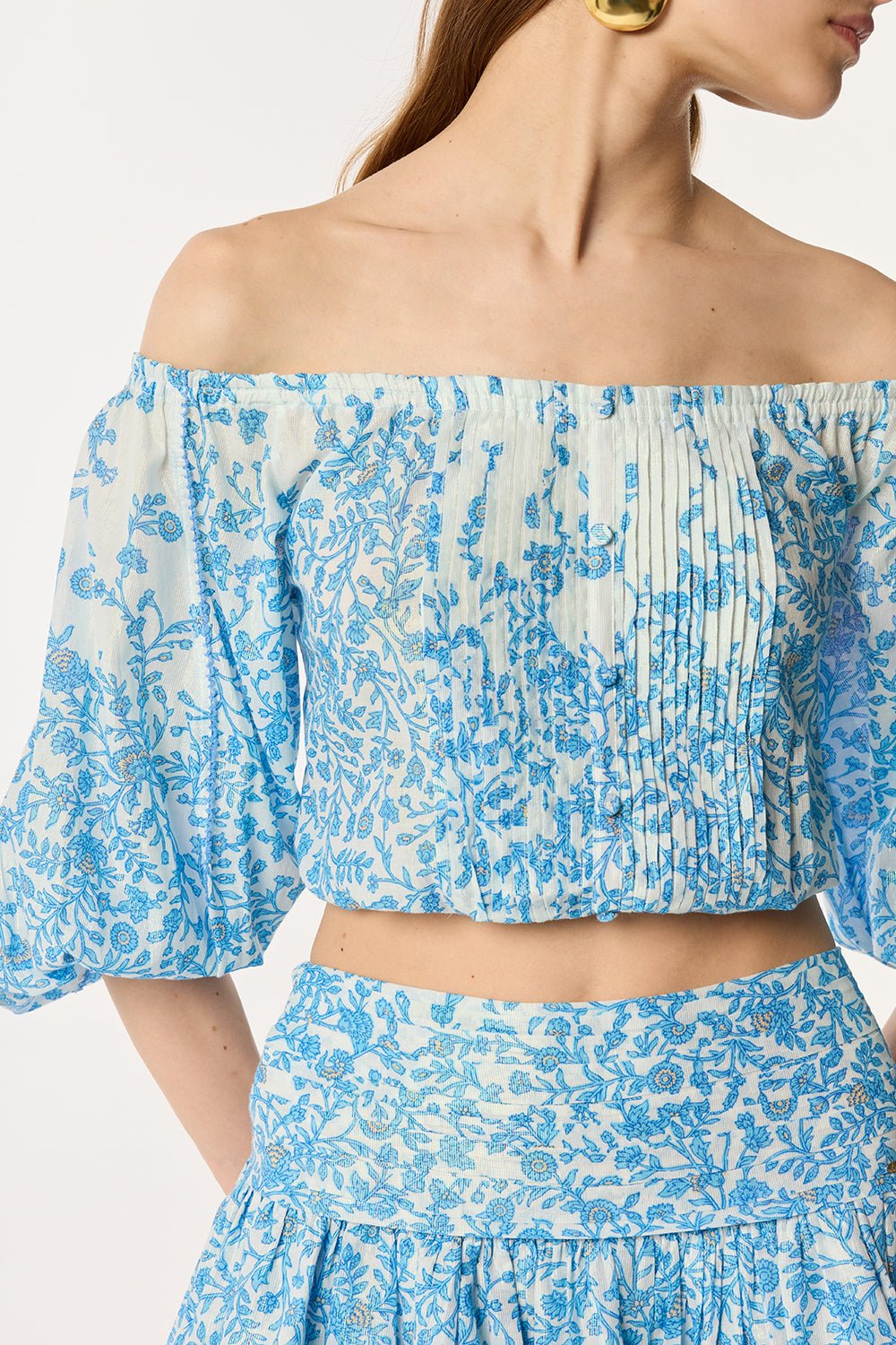 This bloused crop top, with its elastic Bardot neckline, elegantly reveals the shoulders, while its three-quarter sleeves add a sophisticated touch.