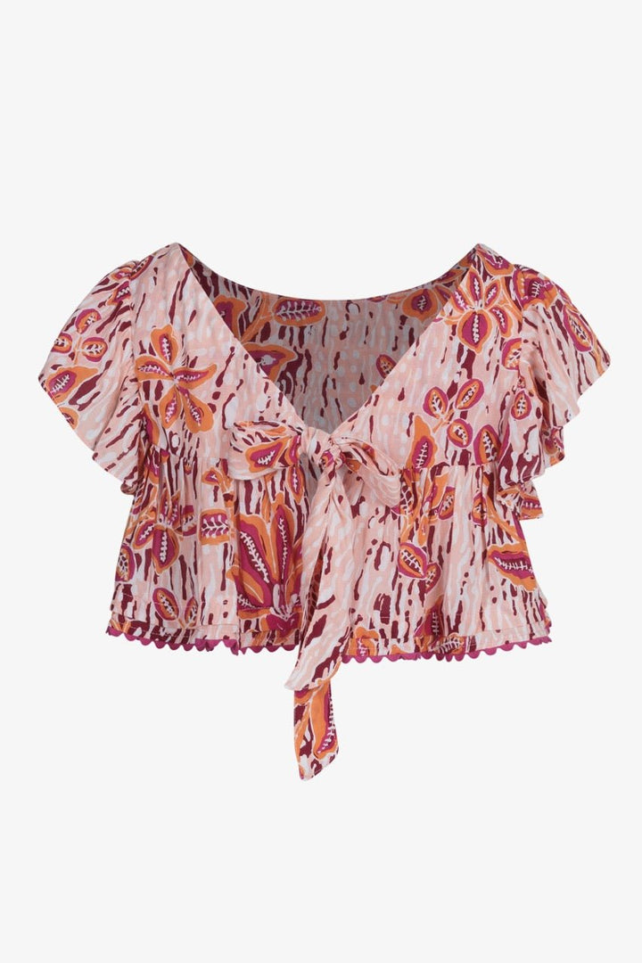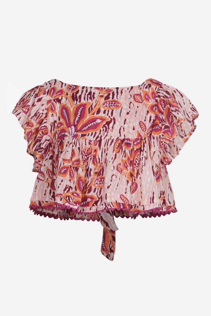 This crop top stands out with its light ruffles along the shoulders and hem, adding movement and charm. A playful bow at the back completes the look. An ideal piece for carefree adventures.